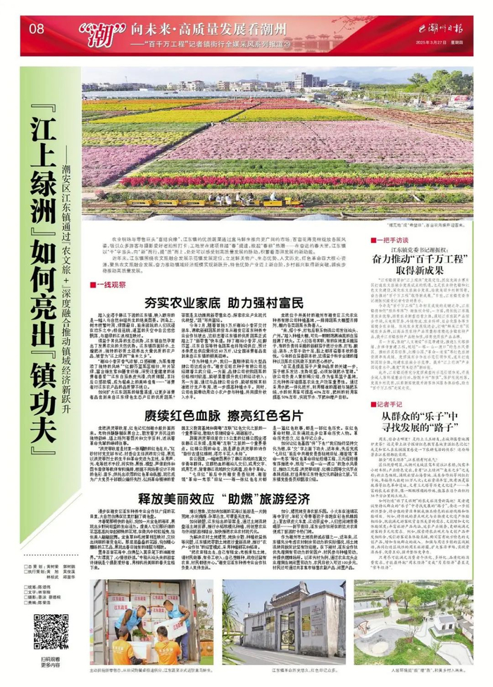 区位优势明显,从潮州主城区驾车前往江东镇,仅需半小时车程;产业特色突出,素有“江上绿洲”“鱼米之乡”之美称;新业态频现,涌现出望山海营地、溪东合作社等网红打卡地,年接待人数超10万人次;文旅资源丰富,既有洪灵菲故居等红色革命遗址,又有三元塔等历史文化遗产……丰富的农文旅资源,像一颗颗璀璨的珍珠,散落在这个面积约38平方公里的土地上。