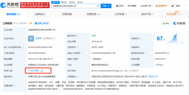 天眼查App显示,小鹿妈妈关联公司安徽鹿妈妈生物科技有限公司成立于2016年5月,法定代表人为岳梦影,注册资本500万人民币,经营范围包括生物科技产品的研发、生产、销售等,由夏泉、芦士琴分别持股90%、10%。2023年年报信息显示,该公司参保人数为1人。