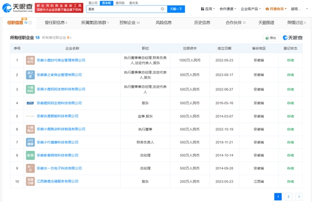 商业履历信息显示,小鹿妈妈创始人夏泉名下关联18家企业,其中14家为存续状态,包括安徽小鹿时代商业管理有限公司、安徽喜之家商业管理有限公司、芜湖小鹿妈妈生物科技有限公司等。夏泉在上述企业担任股东及法定代表人、执行董事、总经理等职务。值得注意的是,其名下的安徽小鹿时代商业管理有限公司、安徽吉鹿智能科技有限公司、芜湖市鹿龙生物科技有限公司等多家公司2023年年报显示参保人数均为0人。