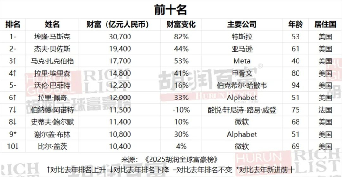 从全球范围来看,埃隆·马斯克五年内第四次蝉联世界首富,并成为首位财富超过4000亿美元的个人。胡润研究院称,埃隆·马斯克的财富飙升了1.38万亿元或82%,达到3.07万亿元人民币,主要归功于特斯拉股价的“特朗普效应”。不过,自榜单截止日期2025年1月15日以来,马斯克的财富已缩水约1000亿美元,因为他参与政府职位、政治激进主义以及来自中国公司的竞争对特斯拉的股价造成了影响。然而,他仍然是世界首富。