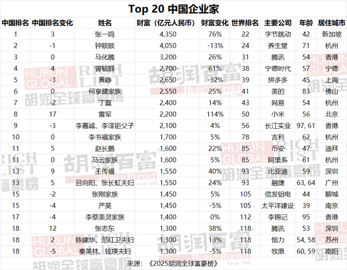 胡润研究院发布的2025胡润全球富豪榜也显示,张一鸣最新财富达4350亿元,较去年增长76%,成为中国首富。