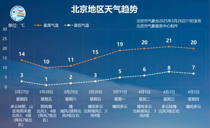 今天(3月27日)至29日,北京气温较前期明显下降,明后天最高气温10、11℃,最低气温仅冰点出头, 建议公众增衣保暖。