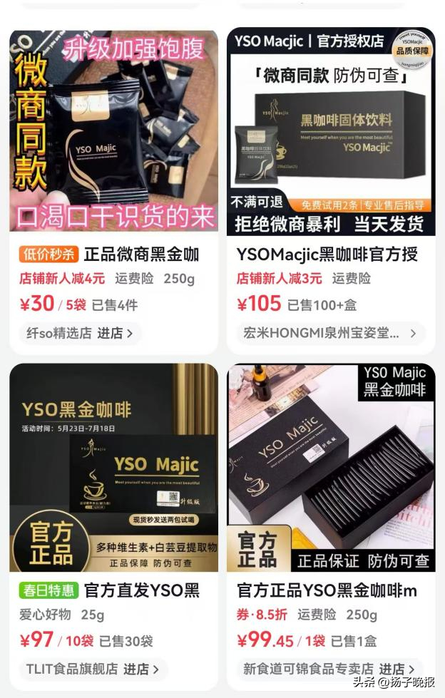 某以低价著称的平台上,也存在众多打着YSO Majic品牌旗号的所谓“黑金咖啡”,部分商家销量已超1.3万件。而在某音搜索YSO Majic等相关品牌,同样弹出了不少不知名小店在售,页面均标注“微商同款”等宣传字眼。