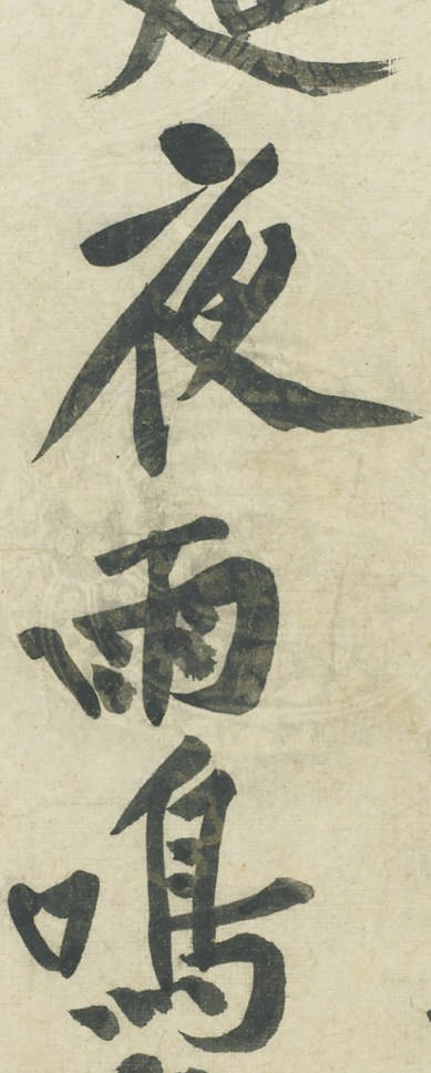 鸡距笔笔头短秃劲健,与鸡爪后突出的鸡距较为相像,由此得名。这种笔大都为有心笔,以麻纸等物裹制成锥形芯柱,再在其外覆兔毛,锋尖硬挺锐利,笔根则粗壮,腰力充沛,书写时只需笔尖蘸墨,一挥而就,收笔时笔锋立即恢复原状,比较易于控制。科举制度使得书写规范统一化,硬毫笔塑造和演绎了楷法的严谨,入笔、顿笔、转折、收笔,笔笔都有装饰性,精雕细琢一般把点画“规定”出完美形状。你可以想象虞世南、薛稷、褚遂良、欧阳询、颜真卿等唐楷巨擘,他们的点画如此精美细腻,可能都因为手中有一支很好用的鸡距笔啊!白居易在《鸡距笔赋》中赞叹坚挺的兔毫配合鸡距的外形堪称完美,可以“画为屈铁、点成垂露”,“使见之者书狂发,秉之者笔力作。挫万物而人文成,草入行而鸟迹落。”但它也有缺点,比如蓄墨量小,不适合较大幅度的提按顿挫等,柳公权曾说鸡距笔“出锋太短,伤于劲硬”,相传他曾经向宣州陈氏求笔,得逸少最爱的笔型却一点都不满意,他喜欢硬毫散卓笔,《蒙诏帖》笔锋的延展性恰好说明了这一点。善写狂草的张旭、怀素当然也是散卓笔的爱好者,以笔力强调速度,鸡距笔应该不能满足需要,在《自叙帖》中,可见笔法已经突破散卓笔的物理极限,通过加速运笔与墨色枯润对比,形成“惊蛇走虺”的视觉效果。李白的《草书歌行》里说“起来向壁不停手,一行数字大如斗。”可见怀素写潇洒的草书大字,首选应该是散卓笔。