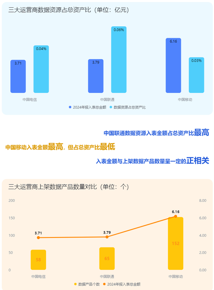 从数据资源与数据产品上架数量的关系来看,三大运营商的入表金额与上架产品数量呈现一定正相关。其中,中国移动全年上架152个数据产品,居三家之首,数据资源入表金额亦为最高;而中国电信上架数量最少,入表金额位列末位。