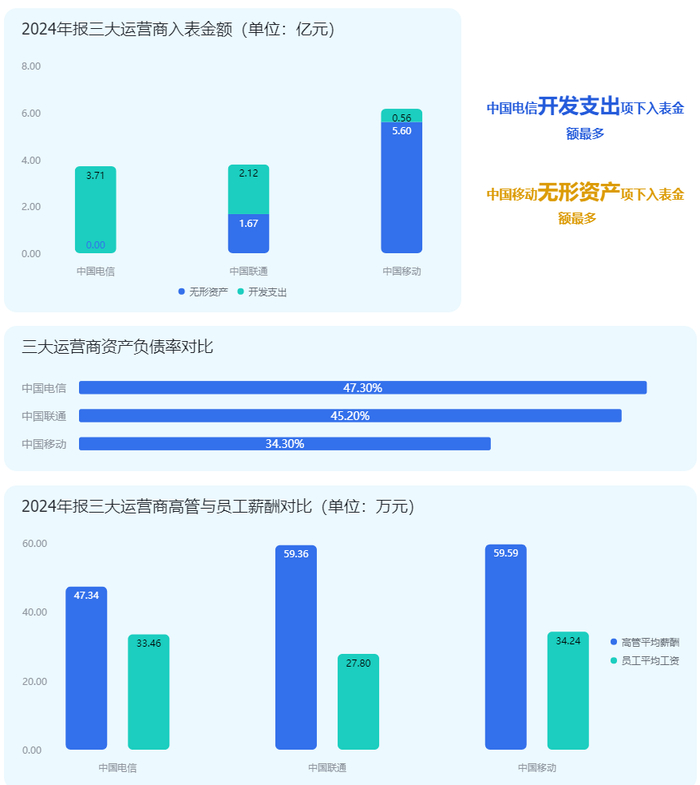 在薪酬结构方面,三家运营商亦呈现一定差异。年报显示,2024年中国移动员工人均薪酬约为34万元,中国联通为27.8万元,中国电信为33万元。高管薪酬方面,中国移动与中国联通均在59万元左右,而中国电信高管薪酬相对较低,约为47万元。