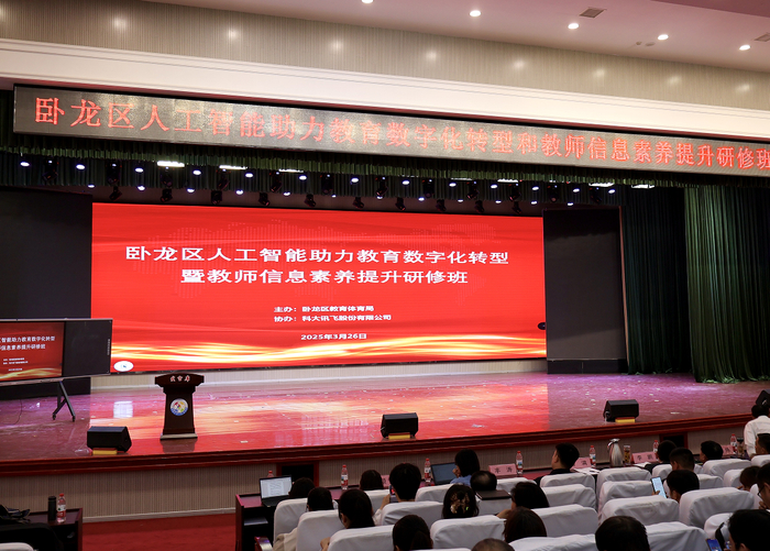 南阳网讯 为深入贯彻落实国家教育数字化战略和人工智能发展规划,提升校长信息化领导力和老师信息化素养能力,促进人工智能与教育教学的深度融合,加快教育数字化转型。3月26日,南阳市卧龙区人工智能助力教育数字化转型暨教师信息素养提升研修班在南阳市第一完全学校报告厅举行,卧龙区教体局副局长李鹏、第一完全学校教育集团小学部校长王建、电教主任闫伟、科大讯飞股份有限公司河南分公司执行总经理方满等出席会议,南阳市卧龙区中小学校校长、副校长、骨干教师等400余人参加了现场培训,会议由科大讯飞智慧教育南阳负责人郗赛赛主持。