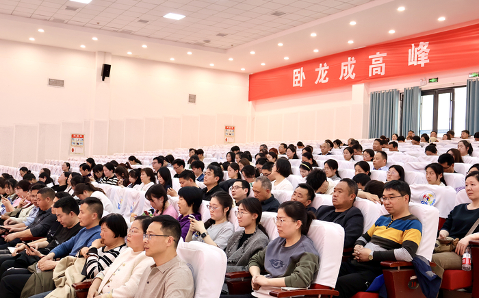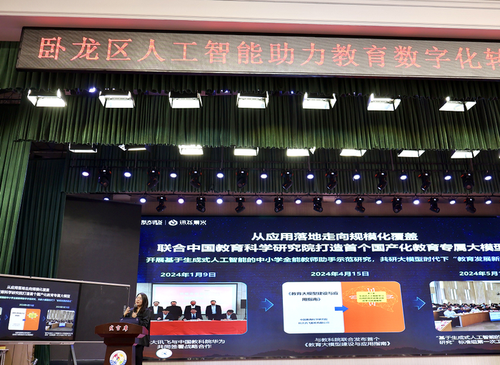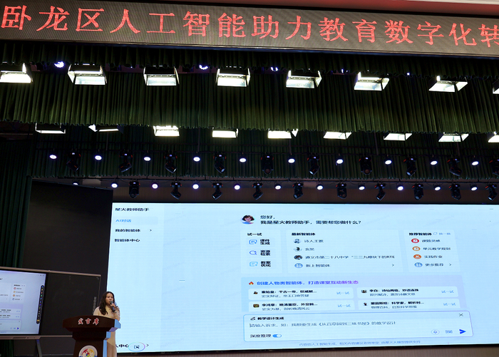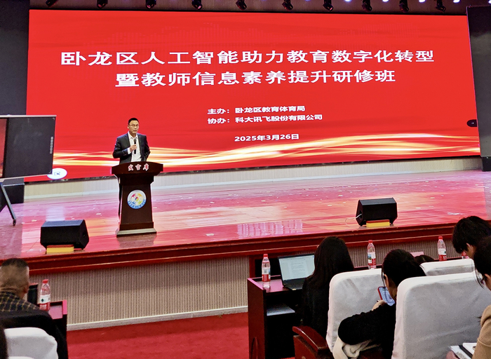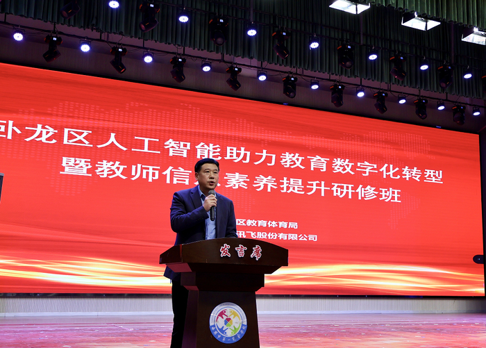 南阳市卧龙区教体局副局长李鹏为会议致词,他表示,人工智能时代浪潮已经席卷而来,教育数字化转型是推动教育高质量发展的必行之路,鼓励校长、老师们积极拥抱时代变革,提升信息化素养和能力,为学校构建智能时代教书育人新生态。