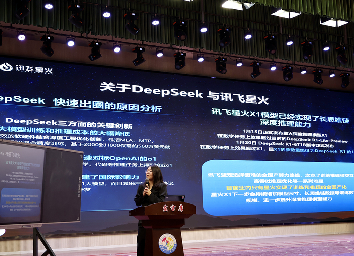 在专题报告环节,科大讯飞河南大区智慧教育咨询总监吴兵可带来《认知大模型技术最新进展及赋能教育时间》的精彩分享。他以DeepSeek和讯飞星火为代表的生成式大模型应用技巧、依托国产教育大模型赋能“教学”“育人”“管理”三大场景的创新实践应用等模块,深入解读了人工智能大模型的前沿技术,分析其在教育领域的应用趋势为参会人员打开了技术视野。