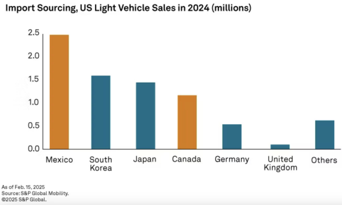 韩国和日本分别是第二大和第三大汽车进口来源国,2024年分别有139.9万和132.2万辆汽车卖到美国。加拿大位居第四,丰田RAV4和本田思域等热门车型从加拿大进口到美国销售。