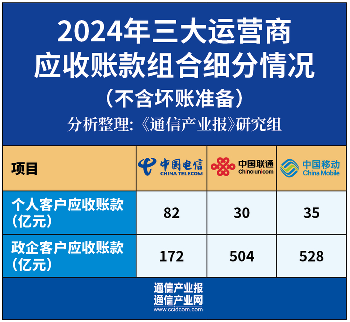 中国电信企业用户应收账款为228.82亿元,其中包含坏账准备56.87亿元;中国联通政企大客户应收账款为702亿元,其中包含坏账准备198亿元;中国移动政企客户应收账款为818.32亿元,其中包含坏账准备290.05亿元。