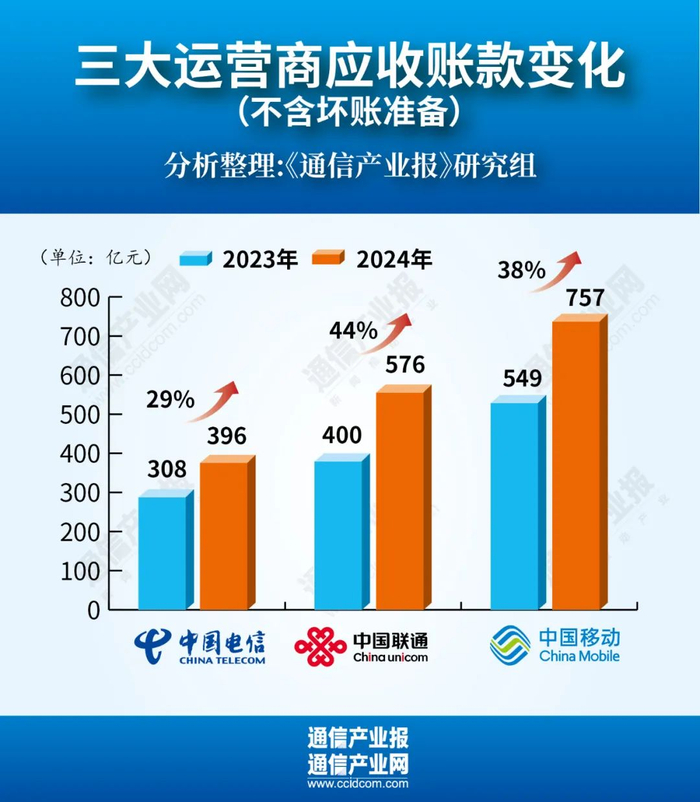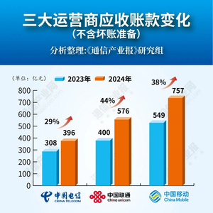 2024年,中国电信、中国联通和中国移动应收账款(不含坏账准备)分别为396亿元、576亿元和757亿元,同比增长29%、44%和38%。