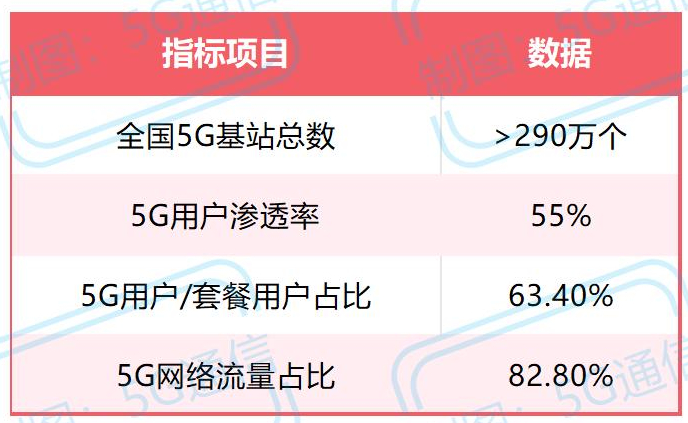 5G网络建设持续推进,截至2024年底,全国共建成5G基站超过290万个,覆盖全国所有地市和县城,大部分乡镇和重点区域。5G用户渗透率达到55%,5G用户/套餐用户占比为63.4%,5G网络流量占比达到82.8%,表明5G已成为移动通信的主要承载网络。