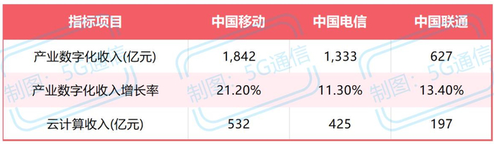 产业数字化收入:中国移动达到1842亿元,同比增长21.2%;中国电信为1333亿元,增长11.3%;中国联通为627亿元,增长13.4%。这表明运营商正在加速从传统通信服务向数字化服务转型。