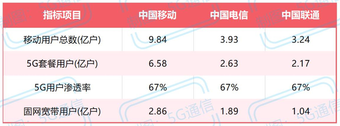 在用户规模方面,中国移动移动用户总数达到9.84亿户,其中5G套餐用户6.58亿户,渗透率达到67%。中国电信移动用户总数3.93亿户,5G套餐用户2.63亿户,渗透率67%。中国联通移动用户3.24亿户,5G套餐用户2.17亿户,渗透率为67%。值得注意的是,三家运营商的5G渗透率均达到了67%,表明5G在国内已进入快速普及阶段。