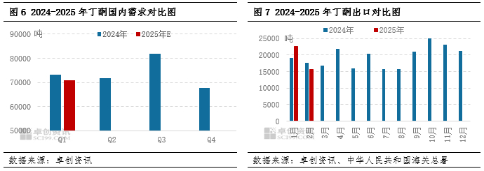 一季度主力工厂多次尝试拉涨市场价格,但国内需求低迷导致江苏及东莞码头库存压力居高不下,持货商难以推涨价格,甚至有让利销售的情况。一季度华东、山东、华南工厂都有短时间检修,但对市场支撑有限。今年出口来看,1月份保持较高外贸订单,但2月份明显下滑。2月份为近五个月出口量首次下降2万吨以内,大幅缩减至1.57万吨。目前2025年丁酮出口量累计38302吨,同比增长4.29%。但2-3月出口订单下跌也导致大量出口量转战国内市场,导致社会库存偏高价格持续回落。