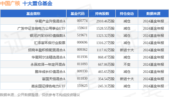 持有中国广核最多的基金为华夏产业升级混合A,目前规模为9.84亿元,最新净值1.7241(3月27日),较上一交易日上涨0.06%,近一年上涨9.61%。该基金现任基金经理为代瑞亮。