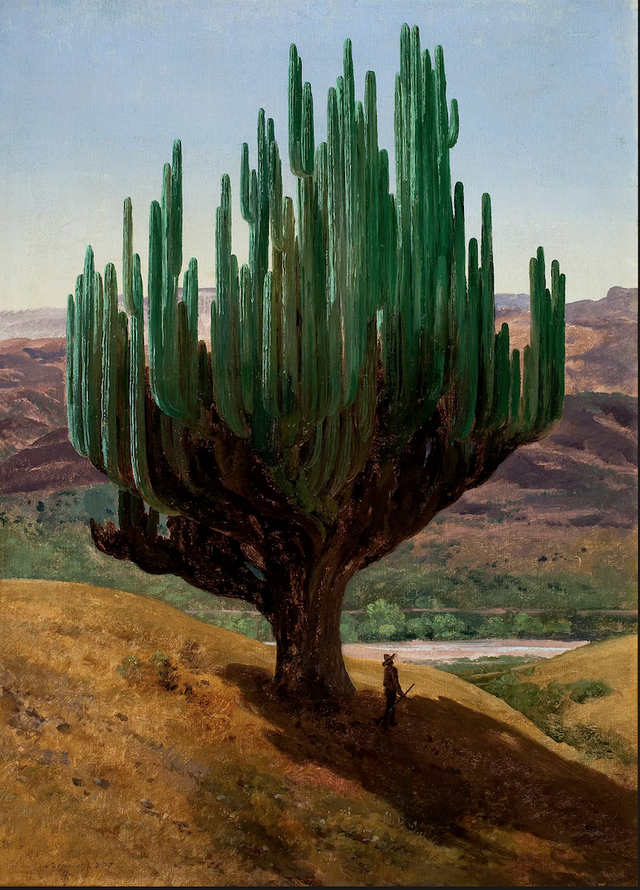他的色彩细腻而明晰,将树叶的蓝绿色调表现得淋漓尽致。他笔下翡翠色的仙人掌和湛蓝色的沙漠天空都让人流连忘返。他的自然研究作品栩栩如生。其中,一幅描绘厚厚的天鹅绒般的玛卡叶的画作,既是一部自然史,也是对自然绿色的热情回应。在画作《卡东,瓦哈卡州》中,一株奇妙的巨型仙人掌是贝拉斯科毕生致力于墨西哥植物的一部分。画作中,微小的人物形象不仅能让观者感受到植物的尺度,还能让人思考人与自然的关系。