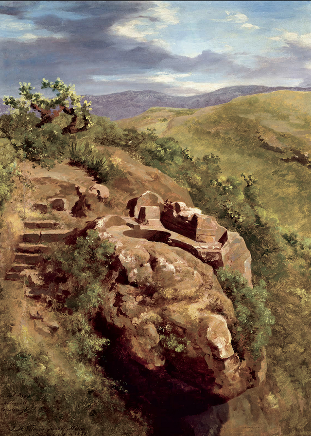如果眼前的风景是棕色或沙漠黄,那么贝拉斯科也会表现出来。他在1878年创作的油画《内萨瓦尔科约特尔国王的浴场》(The Baths of King Nezahualcoyotl)是对古代遗迹的一种非浪漫主义的描绘。他坚持认为,考古学是在破碎的碎片中看到神奇,而非印第安纳·琼斯式的探险。他在对这个前哥伦布遗址的精确描述中,展示了难以解读的砖石碎片和一段古老的台阶。