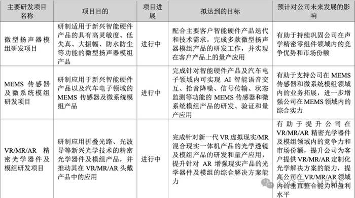 歌尔股份主营业务包括精密零组件业务、智能声学整机业务和智能硬件业务。其中,精密零组件业务聚焦于声学、光学、微电子、结构件等产品方向,主要产品包括微型扬声器/受话器、扬声器模组、触觉器件(马达)、无线充电器件、天线、VR/MR光学器件及模组、AR光学器件、微纳光学器件、3D结构光模组、AR光机模组、AR HUD模组、MEMS声学传感器、其他MEMS传感器、微系统模组、精密结构件等,上述产品广泛应用于智能手机、平板电脑、智能无线耳机、虚拟现实、混合现实、增强现实、AI智能眼镜、智能可穿戴、智能家居、汽车电子等终端产品中。智能声学整机业务聚焦于与声学、语音交互、人工智能等技术相关的产品方向,主要产品包括智能无线耳机、智能音箱等。智能硬件业务聚焦于与娱乐、健康、家居安防等相关的产品方向,主要产品包括虚拟现实产品、混合现实产品、增强现实产品、智能可穿戴产品、智能家用电子游戏机及配件、智能家居产品等。