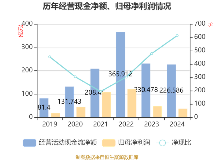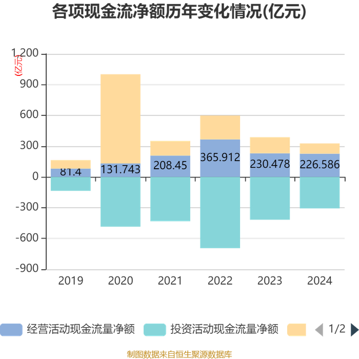 截至2024年,公司经营活动现金流净额为226.59亿元,同比下降1.69%;筹资活动现金流净额99.99亿元,同比减少57.29亿元;投资活动现金流净额-306.69亿元,上年同期为-417.01亿元。