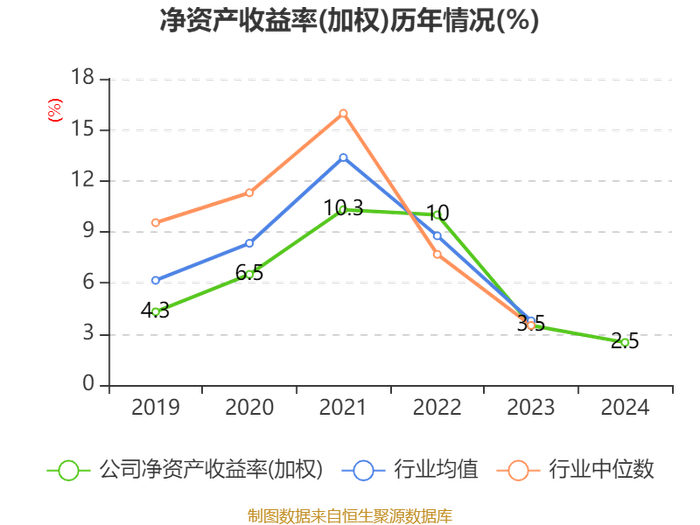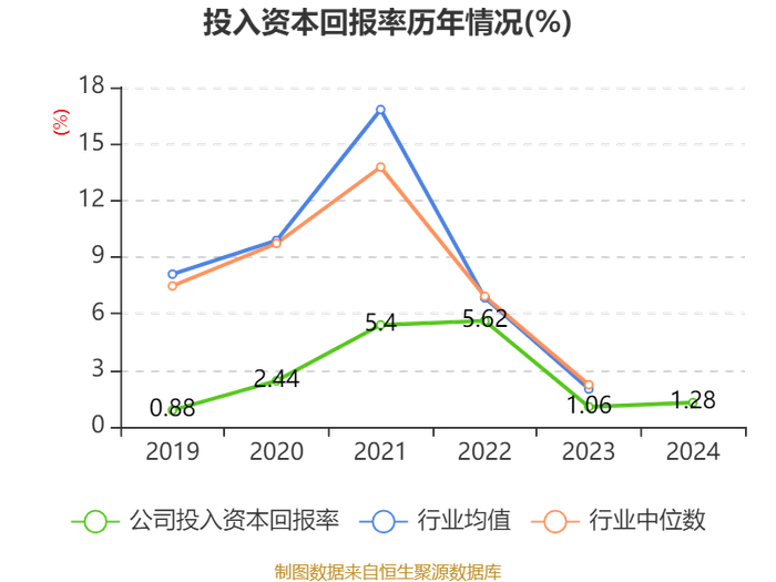 数据显示,2024年公司加权平均净资产收益率为2.5%,较上年同期下降1个百分点。公司2024年投入资本回报率为1.28%,较上年同期上升0.22个百分点。