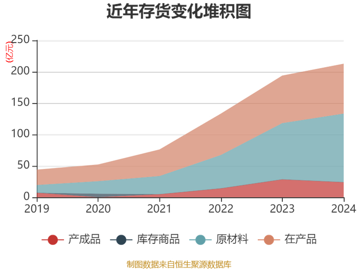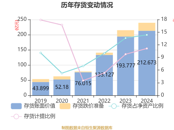 从存货变动来看,截至2024年末,公司存货账面价值为212.67亿元,占净资产的14.35%,较上年末增加18.9亿元。其中,存货跌价准备为26.61亿元,计提比例为11.12%。