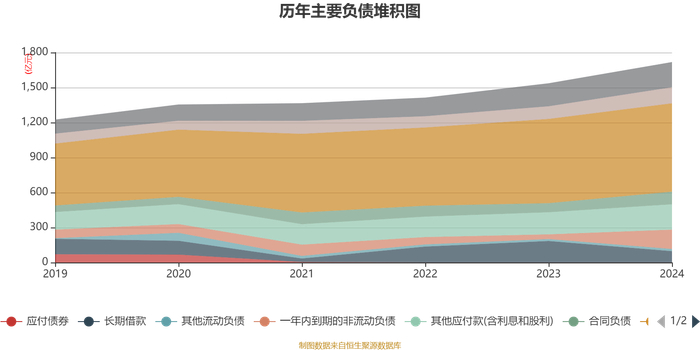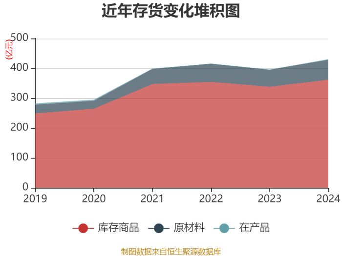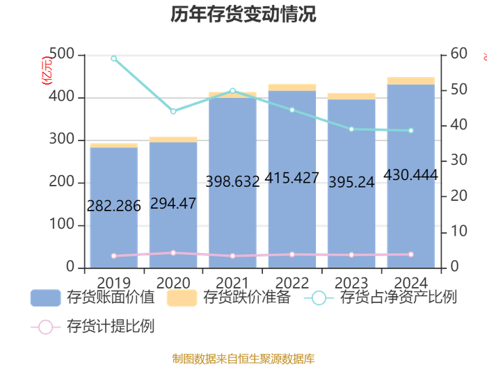 从存货变动来看,截至2024年末,公司存货账面价值为430.44亿元,占净资产的38.65%,较上年末增加35.2亿元。其中,存货跌价准备为16.73亿元,计提比例为3.74%。