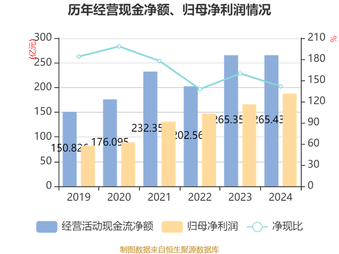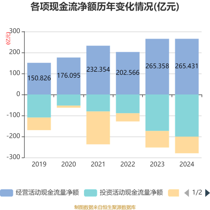 截至2024年,公司经营活动现金流净额为265.43亿元,同比增长0.03%;筹资活动现金流净额-79.14亿元,同比增加672.33万元;投资活动现金流净额-200.74亿元,上年同期为-173.4亿元。