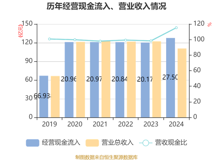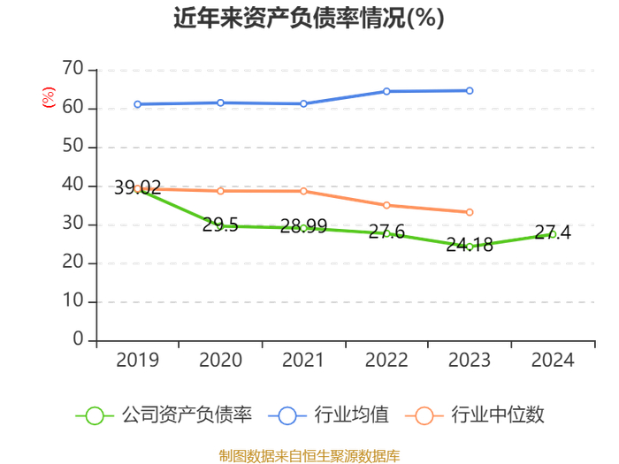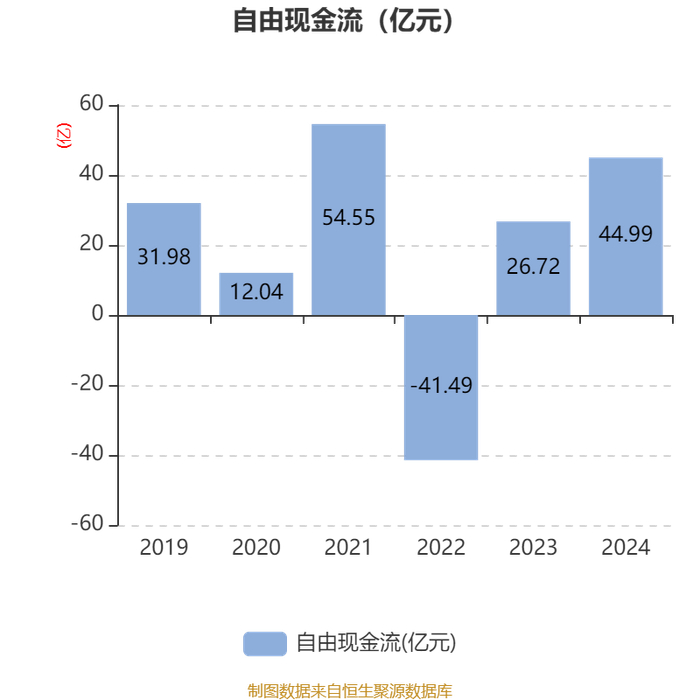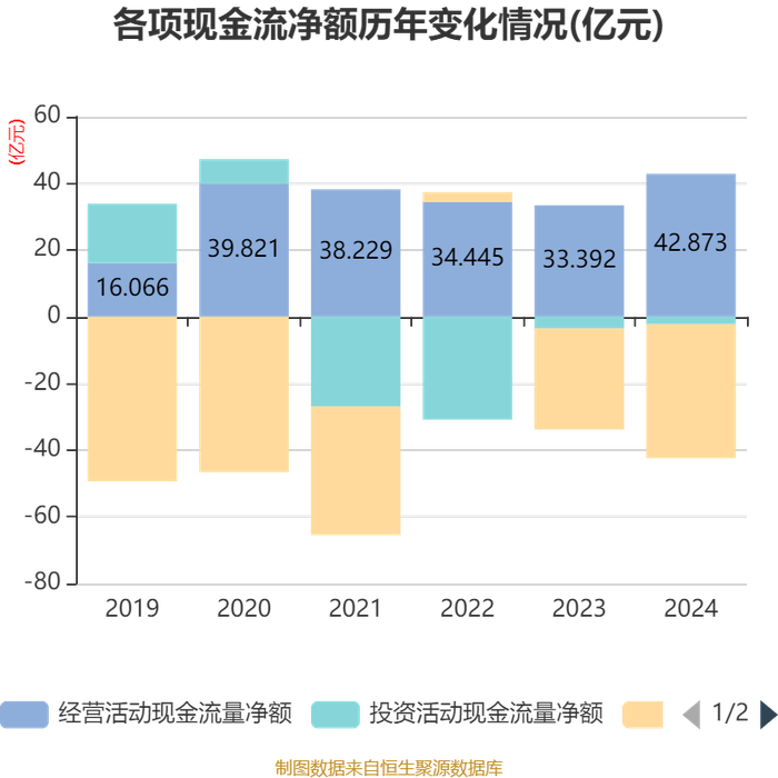 截至2024年,公司经营活动现金流净额为42.87亿元,同比增长28.4%;筹资活动现金流净额-40.2亿元,同比减少9.92亿元;投资活动现金流净额-2.21亿元,上年同期为-3.49亿元。