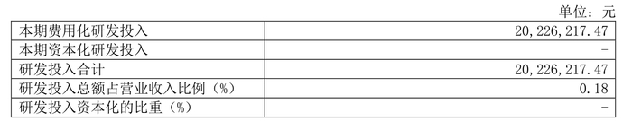 2024年全年,公司研发投入金额为2022.62万元,同比下降59.8%;研发投入占营业收入比例为0.18%,相比上年同期下降0.23个百分点。此外,公司全年研发投入资本化率为0%。