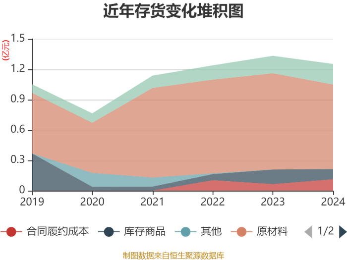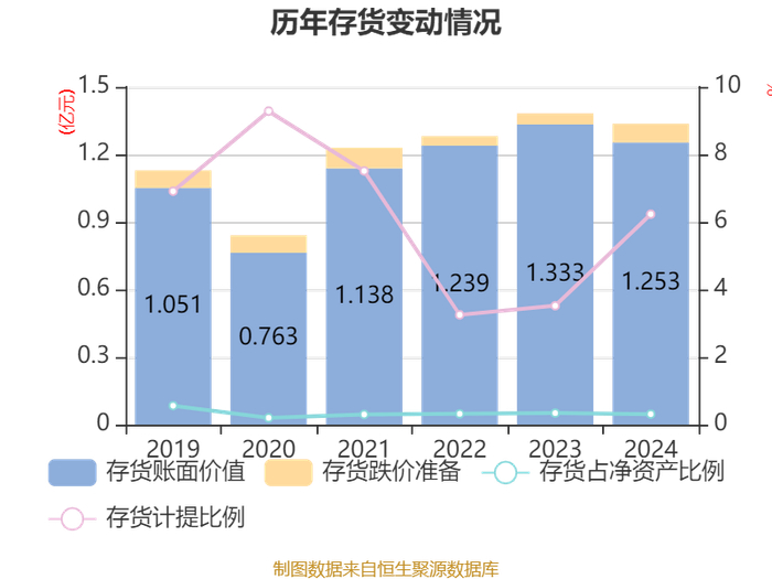 从存货变动来看,截至2024年末,公司存货账面价值为1.25亿元,占净资产的0.31%,较上年末减少802.78万元。其中,存货跌价准备为832.95万元,计提比例为6.23%。