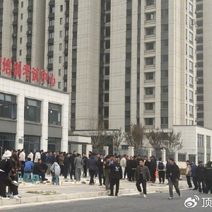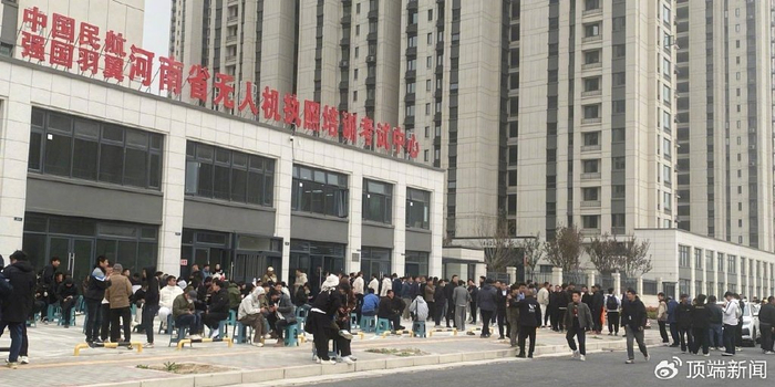 当天上午,在郑州市中原区建设西路附近的中国民航强国羽翼河南省无人机执照培训考试中心,参加无人机驾驶员执照考试的考生排成长队候考。