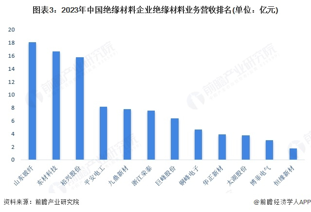 2023年,我国绝缘材料企业绝缘材料业务营收差异较大。其中,山东玻纤绝缘材料业务营收超过18亿元,东材科技、裕兴股份绝缘材料业务营收在15亿元以上,领先于其他企业。
