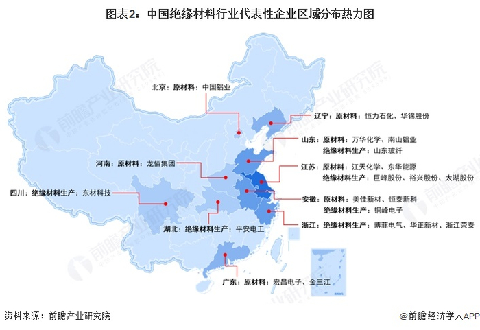 从绝缘材料行业代表性企业的区域分布来看,企业多分布于我国中东部地区。其中,江苏、安徽、浙江、山东绝缘材料行业的代表性企业数量较多。