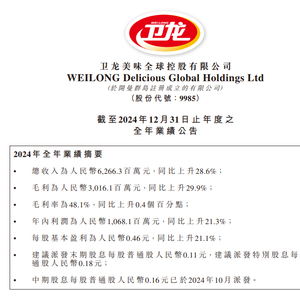 3月27日晚间,卫龙美味(股票代码:9985.HK)发布2024年全年业绩报告,卫龙美味2024年总营收为62.66亿元(人民币,下同),较去年同比增长28.6%。净利润约10.68亿元,同比上升21.3%。