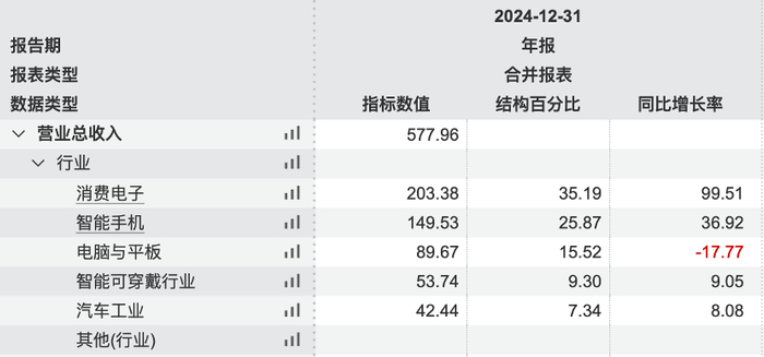 Wind数据显示,消费电子是营收增幅最大的板块,当期实现收入203.38亿元,同比增长99.51%;其次是智能手机板块实现收入149.53亿元,同比增长36.92%;智能可穿戴、工业与汽车增幅较小,分别同比增长9.05%、8.08%;电脑与平板收入则同比下滑17.77%。