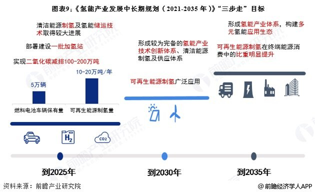 《规划》为氢能产业发展提出了阶段性目标,为氢能科技创新和产业高质量发展指明了大致方向。到2025年,中国要形成较为完善的氢能产业发展制度政策环境,产业创新能力显著提高,基本掌握核心技术和制造工艺,初步建立较为完整的供应链和产业体系。氢能示范应用取得明显成效,清洁能源制氢及氢能储运技术取得较大进展,市场竞争力大幅提升,初步建立以工业副产氢和可再生能源制氢就近利用为主的氢能供应体系。燃料电池车辆保有量约5万辆,部署建设一批加氢站。可再生能源制氢量达到10-20万吨/年,成为新增氢能消费的重要组成部分,实现二氧化碳减排100-200万吨/年。