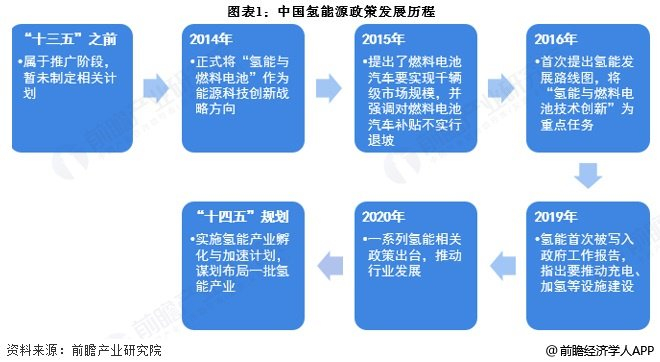 中国的氢能与燃料电池研究始于上世纪50年代,但早期国内氢能源的政策属于推广阶段,到“十三五”期间,氢能源相关政策增多,并且2019年首次在政府报告中提及,“十四五”规划中也提出氢能源发展。