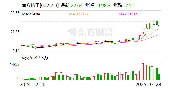 南方精工跌停,龙虎榜上机构买入2080.61万元,卖出1518.24万元
