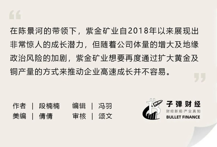 在陈景河的带领下,紫金矿业自2018年以来展现出非常惊人的成长潜力,但随着公司体量的增大及地缘政治风险的加剧,紫金矿业想要再度通过扩大黄金及铜产量的方式来推动企业高速成长并不容易。
