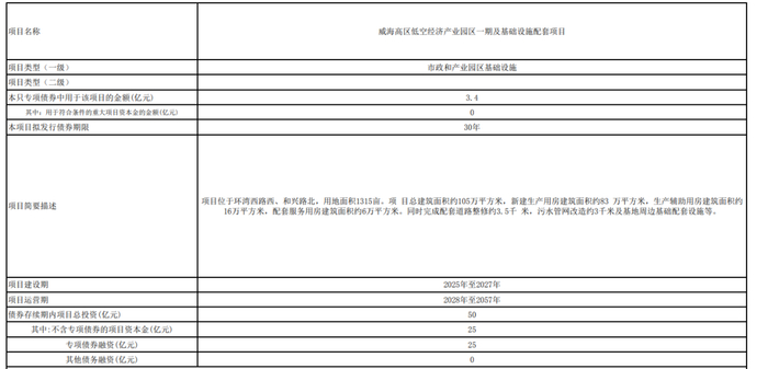 根据山东省财政厅披露,该专项债将投向威海高区低空经济产业园区一期及基础设施配套项目。该项目在债券存续期内总投资为50亿元,其中不含专项债券的项目资本金25亿元,专项债券融资25亿元。