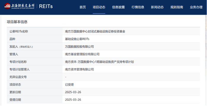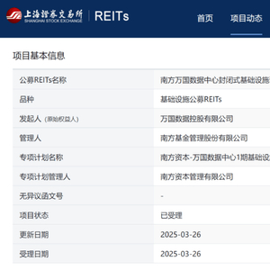 新华财经北京3月28日电(可达)上交所网站显示,3月26日,由万国数据控股有限公司(简称“万国数据”)作为原始权益人的南方万国数据中心封闭式基础设施证券投资基金(以下简称“南方万国数据中心REIT”)状态更新为“已受理”。3月25日南方万国数据中心REIT启动申报程序,在正式申报1天后即获上交所受理,这是市场首批数据中心公募REITs之一。