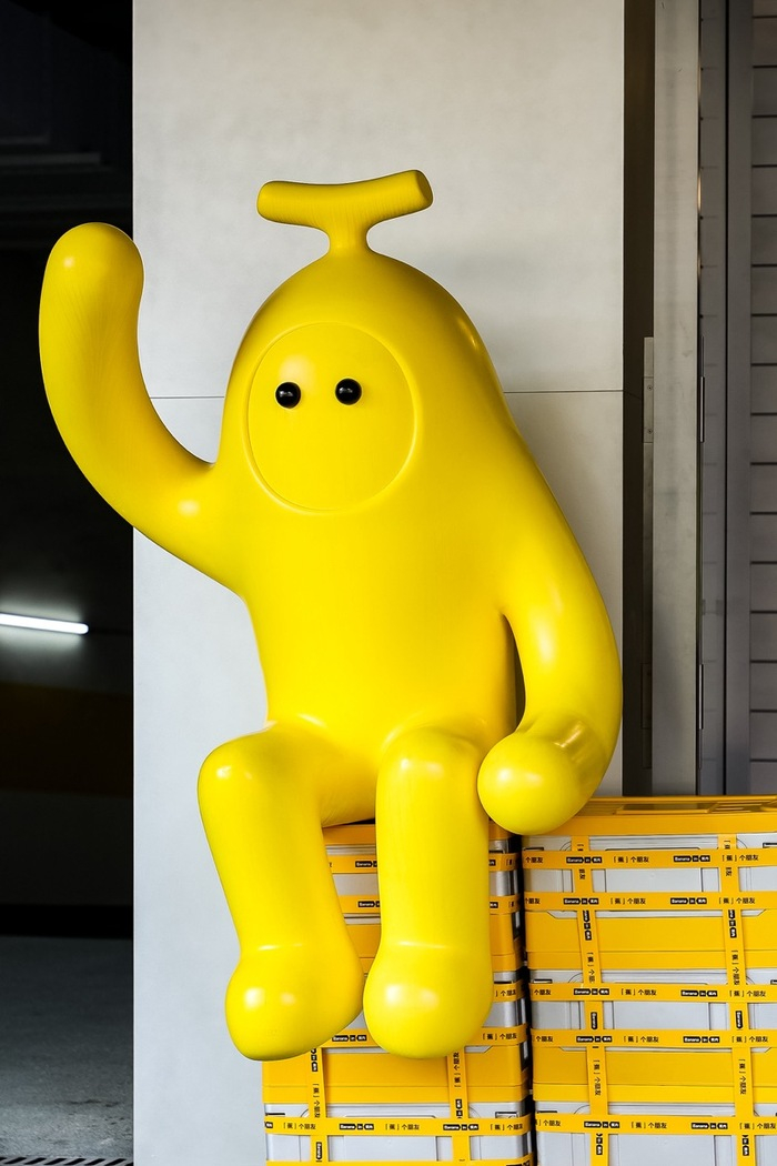 门店整体以“车站”为设计灵感,入口环形车道处还设计了蕉内自有IP“梗梗”,增强品牌门店的视觉。店内空间以BOX为基本单元形成货柜体系,利用可塑的铝板材料构建灵活多变的商业空间。门店还设有可供宠物憩息停留的“无便”空间。此外,消费者还可于门店挑选T恤搭配贴纸进行个性化印花。
