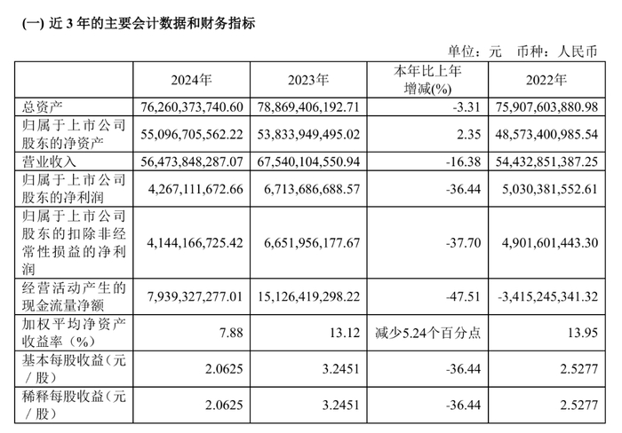 2024年,中国中免全年实现营业收入564.74亿元,同比下降16.38%;归属上市公司股东的净利润42.67亿元,同比大幅下降36.44%;经营活动产生的现金流量净额79.39亿元,同比下降47.51%。