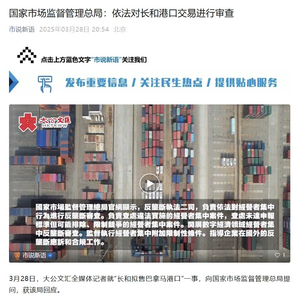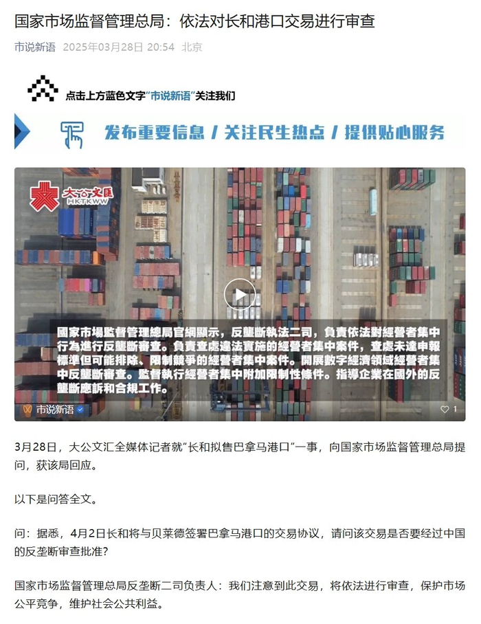 3月28日,大公文汇全媒体记者就“长和拟售巴拿马港口”一事,向国家市场监督管理总局提问,获该局回应。