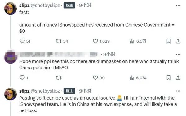 甲亢哥团队的视频制作人也第一时间在社媒上公开回应,此次中国行全程自费,团队没有从中国政府方面获得一分钱。