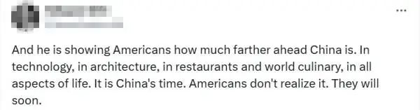 “他向美国人展示了中国有多么领先。无论是技术、建筑、餐厅还是世界烹饪,还是生活的各个方面。这是中国时代。许多美国人还没有意识到这一点。但他们很快就会意识到。”