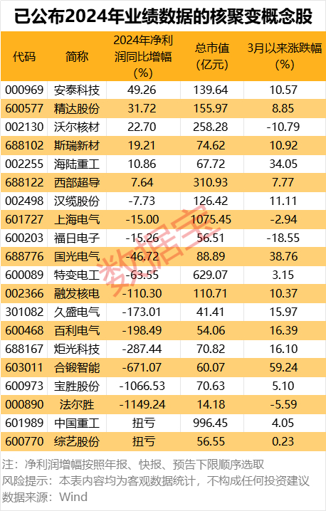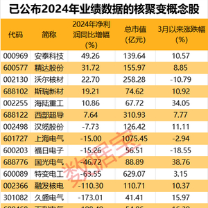 据数据宝统计,A股30多只核聚变概念股中,已有20只发布2024年业绩数据,其中6只业绩同比增长,2只扭亏。以年报、快报、业绩预告下限统计,安泰科技净利润增幅近50%,精达股份增幅超30%,沃尔核材、斯瑞新材、海陆重工增幅也居前,中国重工、综艺股份为扭亏。