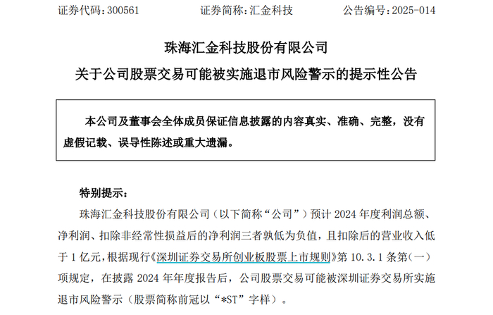 根据相关规定,在披露2024年年度报告后,汇金科技股票交易可能被深圳证券交易所实施退市风险警示(股票简称前冠以“*ST”字样)。